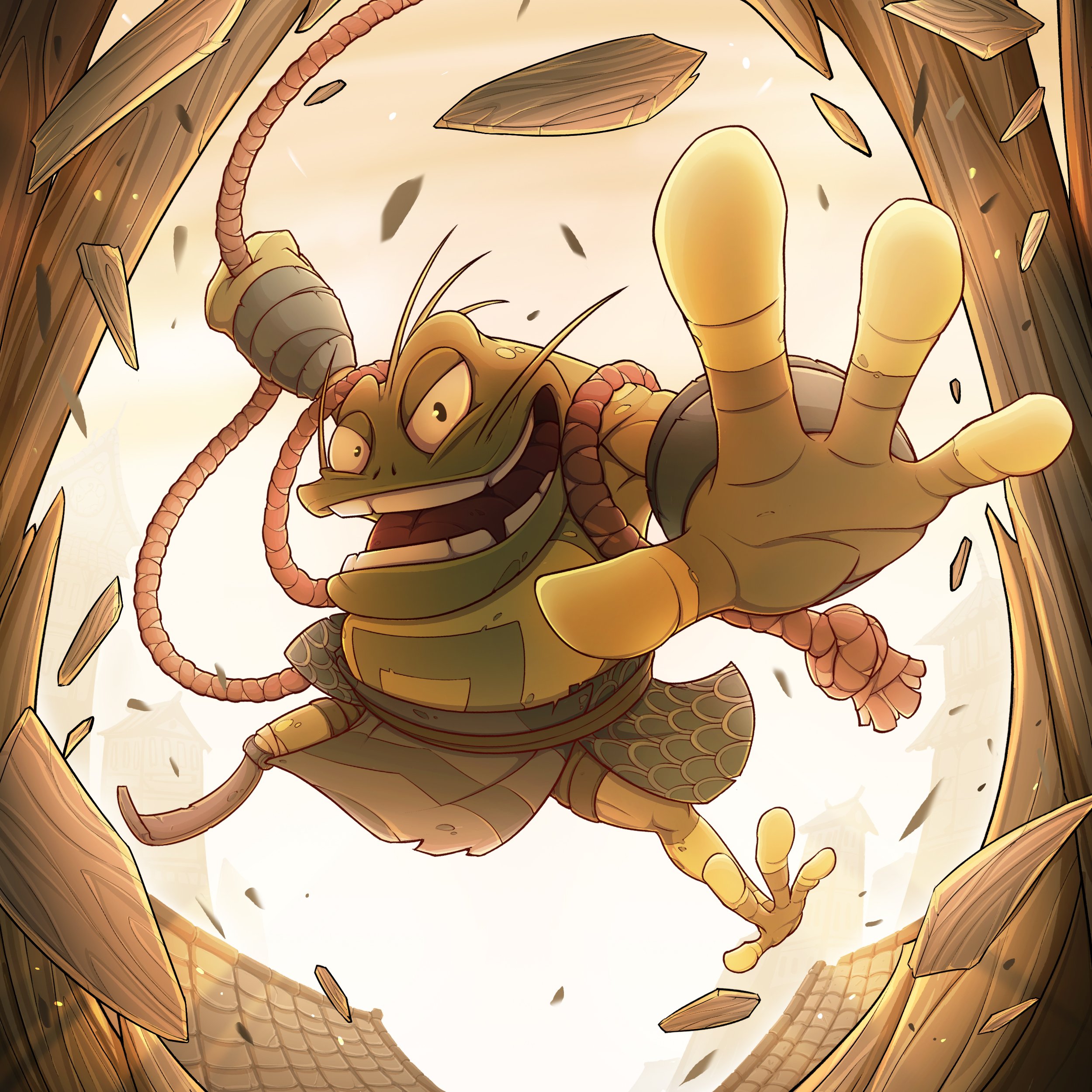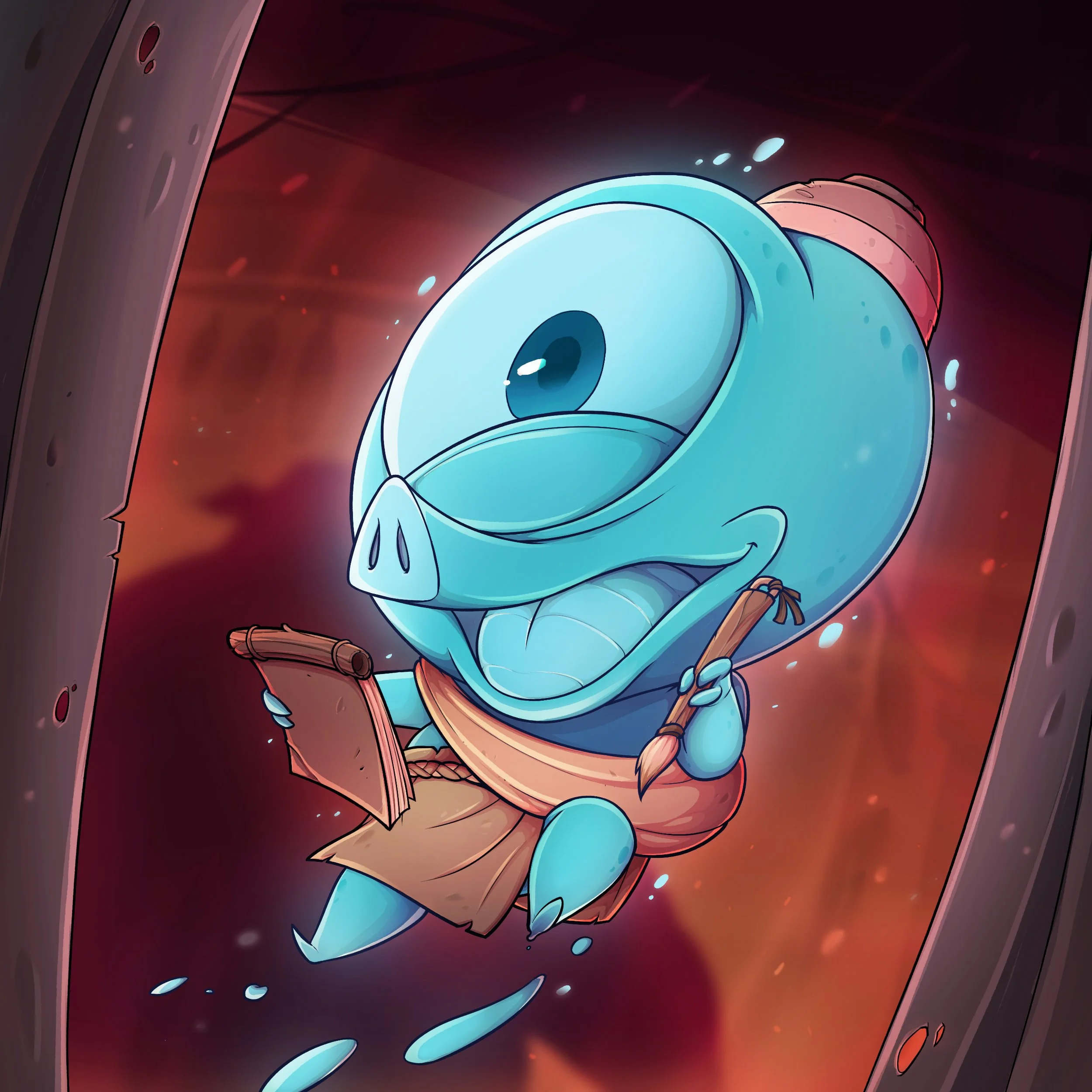 Bloody Frog is a creature that looks like a normal frog in the Human World. He is small and moves very fast. Bloody Frog fancies stealing shiny objects. Since he and Rocky Dog don’t like each other, they often play “cop and thief”.