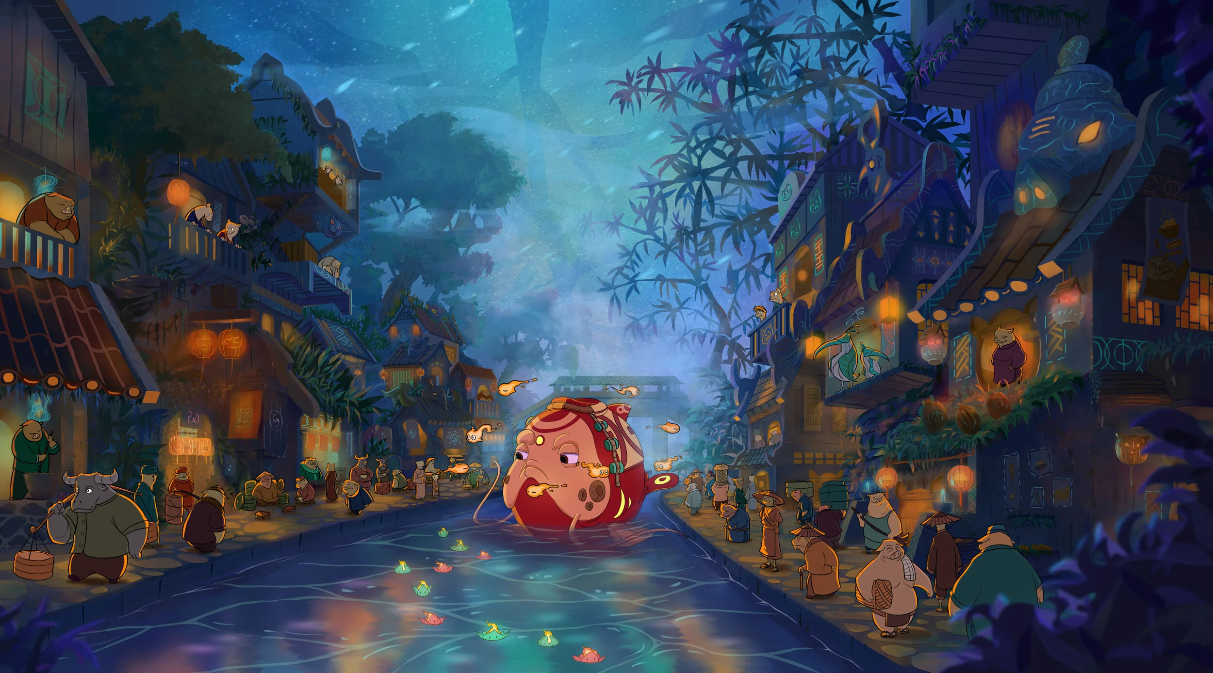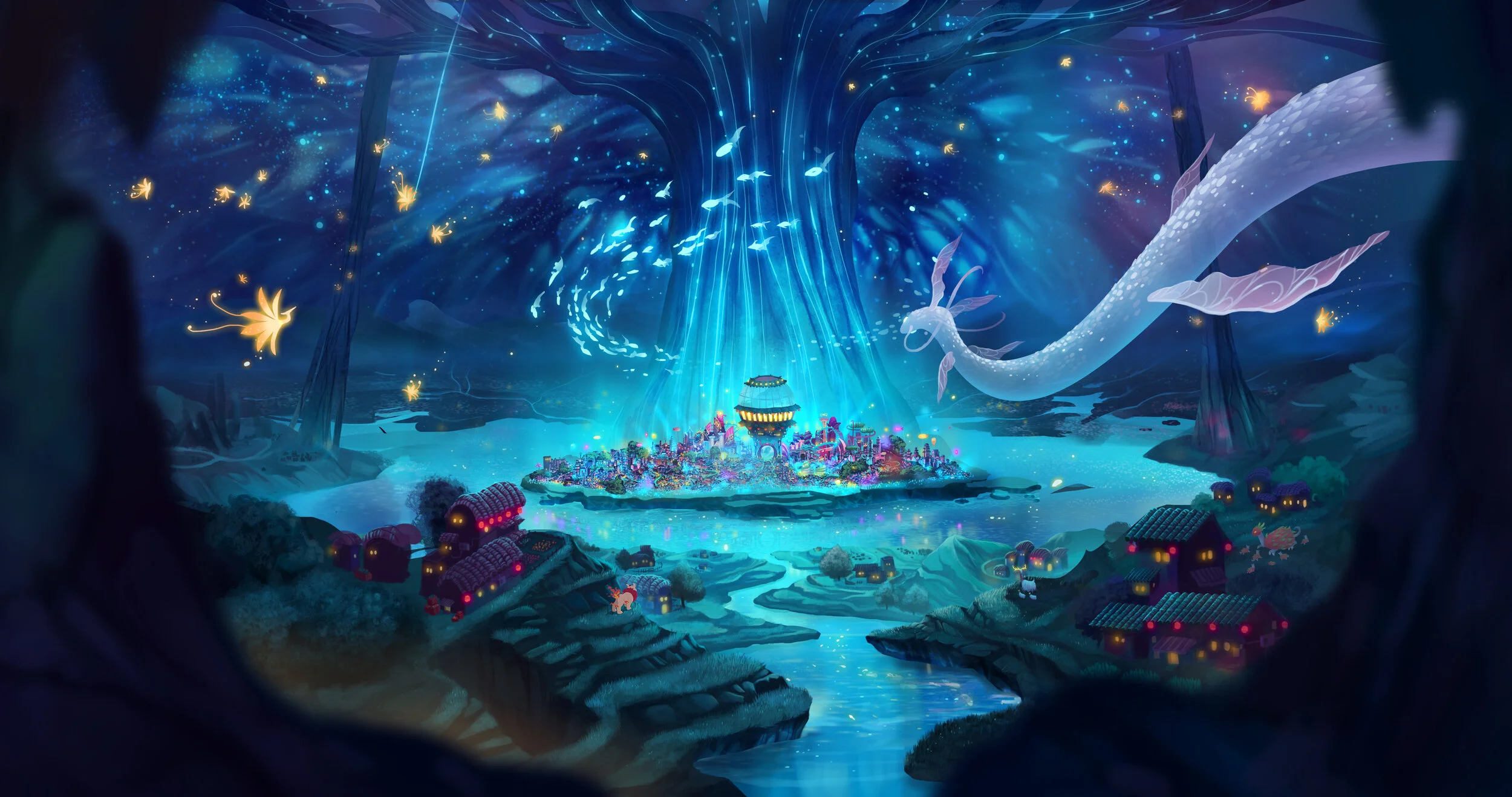 Existing alongside the Human World, Linh World is enormous and divided into organized regions. The story of Linh, Magic Powder takes place in Karma city - the liveliest area of Linh World. At the center of the city is a giant Karma Tree with branches covering all over Linh World and forming the sky of this place. Therefore, day is as dark as night and the skylight always appears with mysterious hues of purple and blue. The Karma City is separated into different districts, suitable for each creature’s lifestyle, customs, and culture.
